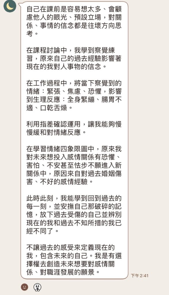 課後,我看見她專心的跟上練習節奏,在職場中運用課中所學習的放鬆技巧,高壓的職場中能游刃有餘的處理自我感受,也願意再給自己機會,去試著創造感情、職涯的新願景。